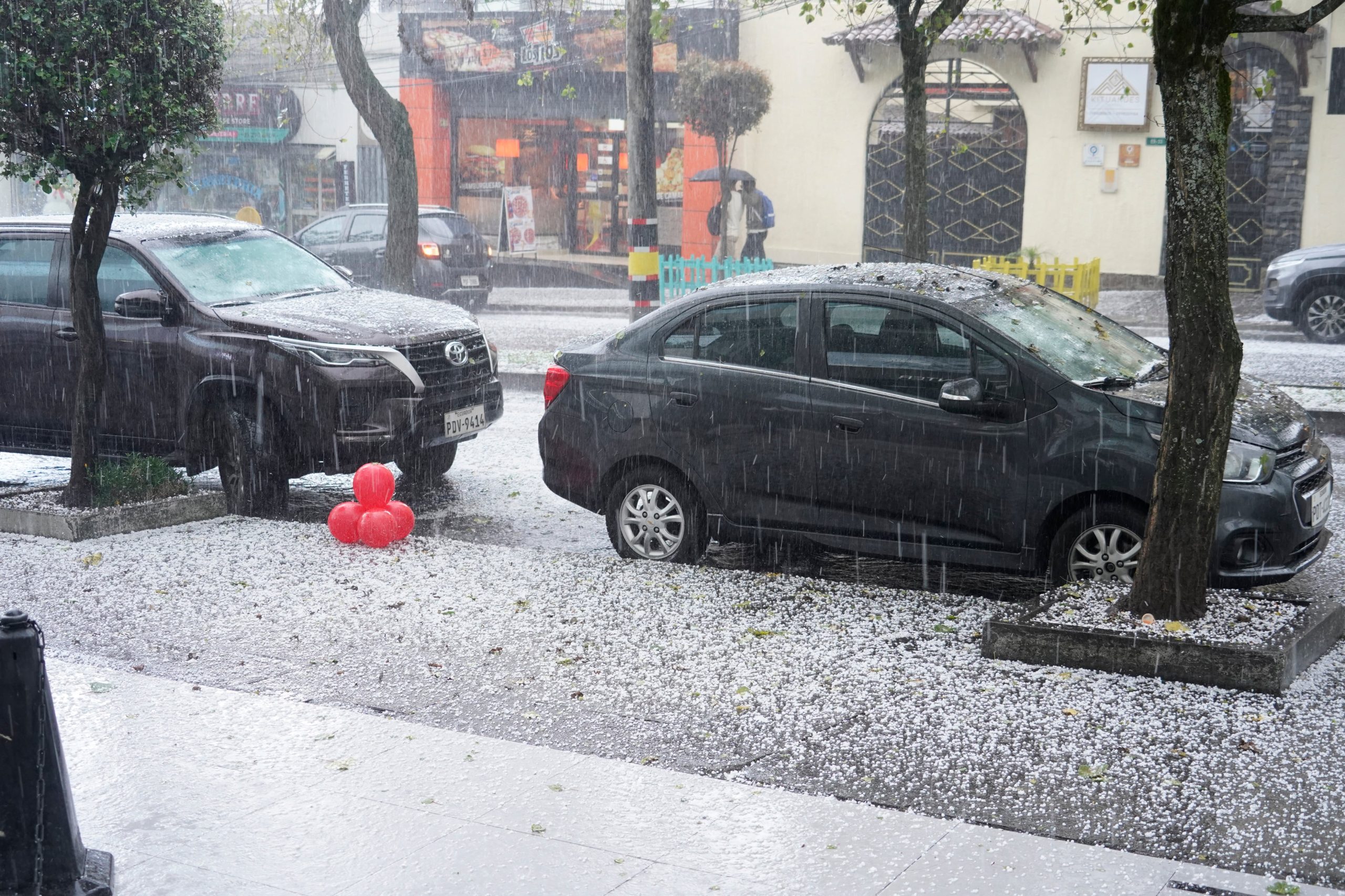 Lo que era un día soleado, con personas caminando en camiseta, comiendo un helado o buscando lugares con sombra, se convirtió en una ciudad cubierta por un cielo oscuro, neblina en las montañas y pequeñas gotas de lluvia que incrementaron su nivel y fuerza en cuestión de segundos.