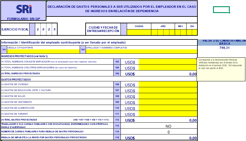 El Servicio de Rentas Internas (SRI) publicó el nuevo formulario de proyección de gastos personales que se aplicará para este 2025 una vez que el Instituto Nacional de Estadística y Censos (INEC) estableció el costo de la canasta familiar que es el indicador que sirve para definir los topes de gastos que se pueden presentar para pagar menos impuesto a la renta.